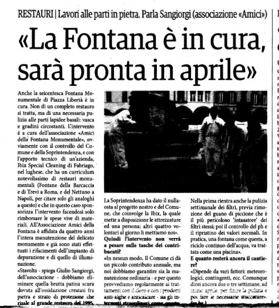 Il lavoro è consistito nella pulitura del materiale lapideo da vari depositi che avevano completamente annerito il monumento, riportando alla luce il bianco del marmo, una veste, quella della fontana ripulita che ha sorpreso molti abitanti, sopratutto fra i più giovani abituati a vederla da oltre vent'anni fortemente ingrigita.